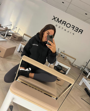 Elevate your comfort and style with our exclusive ReformX Pilates hoodie! Crafted with front pockets, an adjustable drawstring hood, and adorned with chic white embroidery, front and back, on a sleek black canvas. Get ready to flaunt your allegiance to Sydney's favourite pilates studios in unparalleled style!